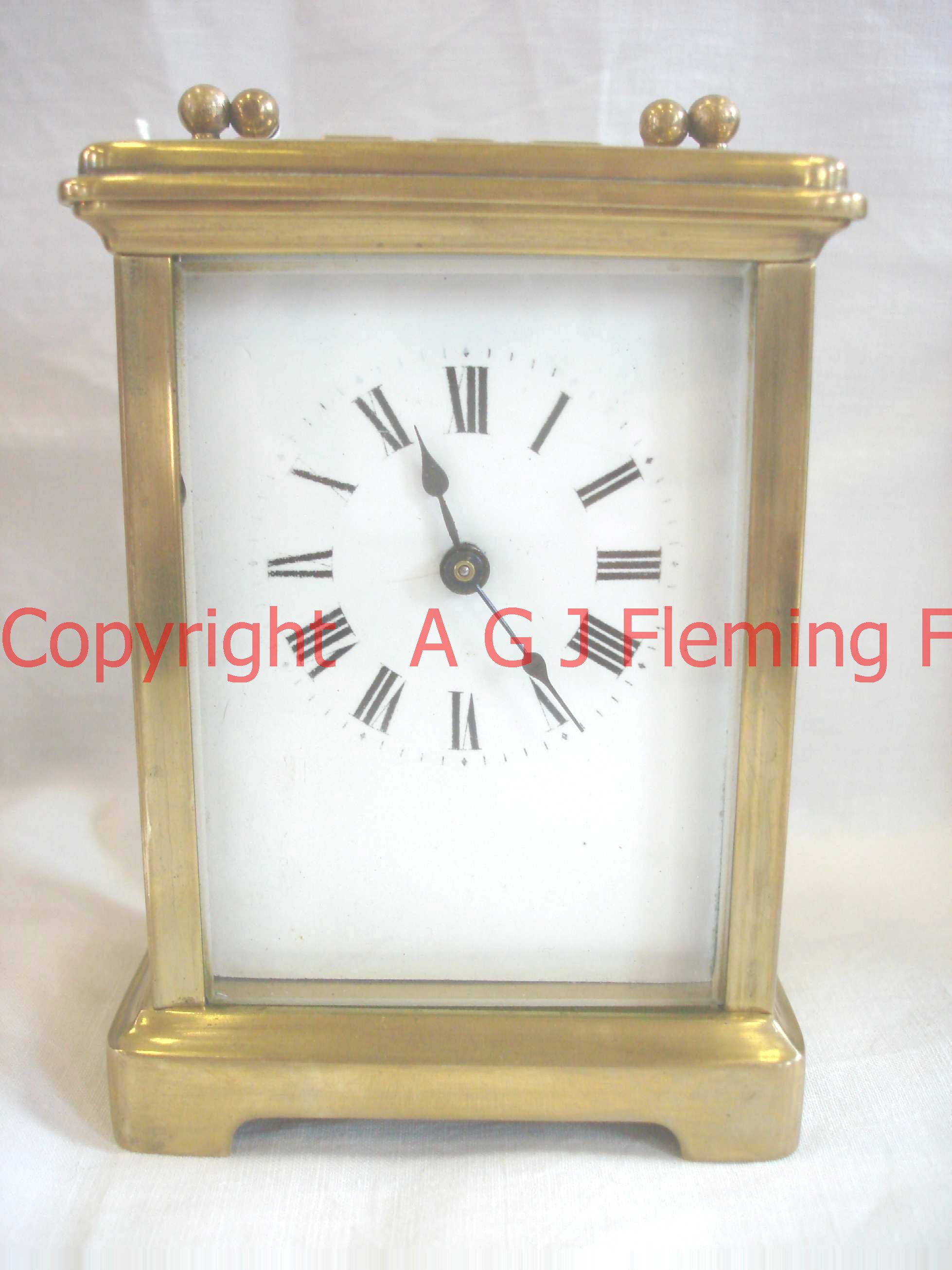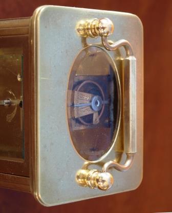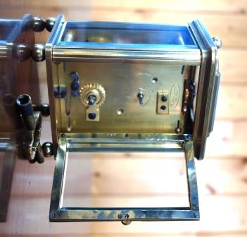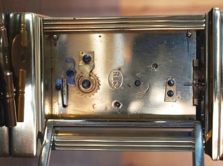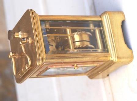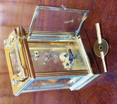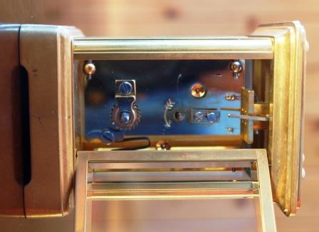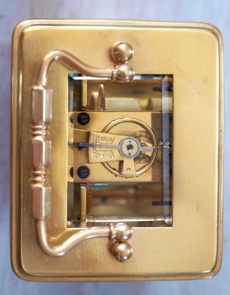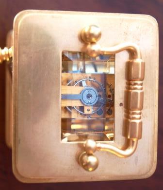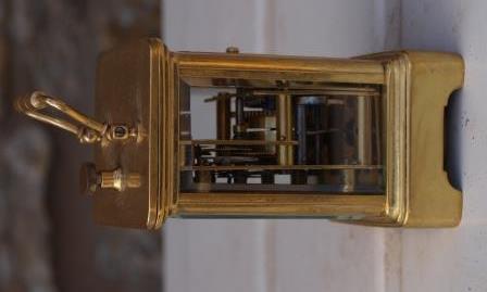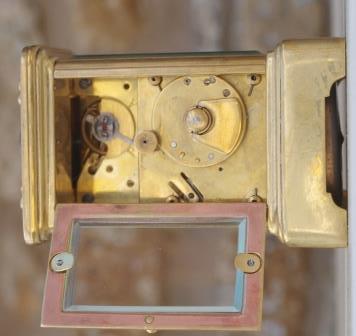 This is an Corniche-cased striking carriage clock with a 90° English lever/club-tooth escape wheel platform.