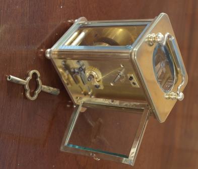 This is an Obis (timepiece) carriage clock movement with a cylinder platform in a modern Anglaise case.