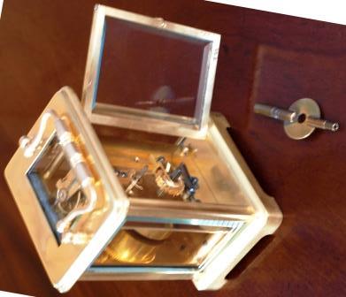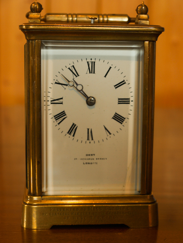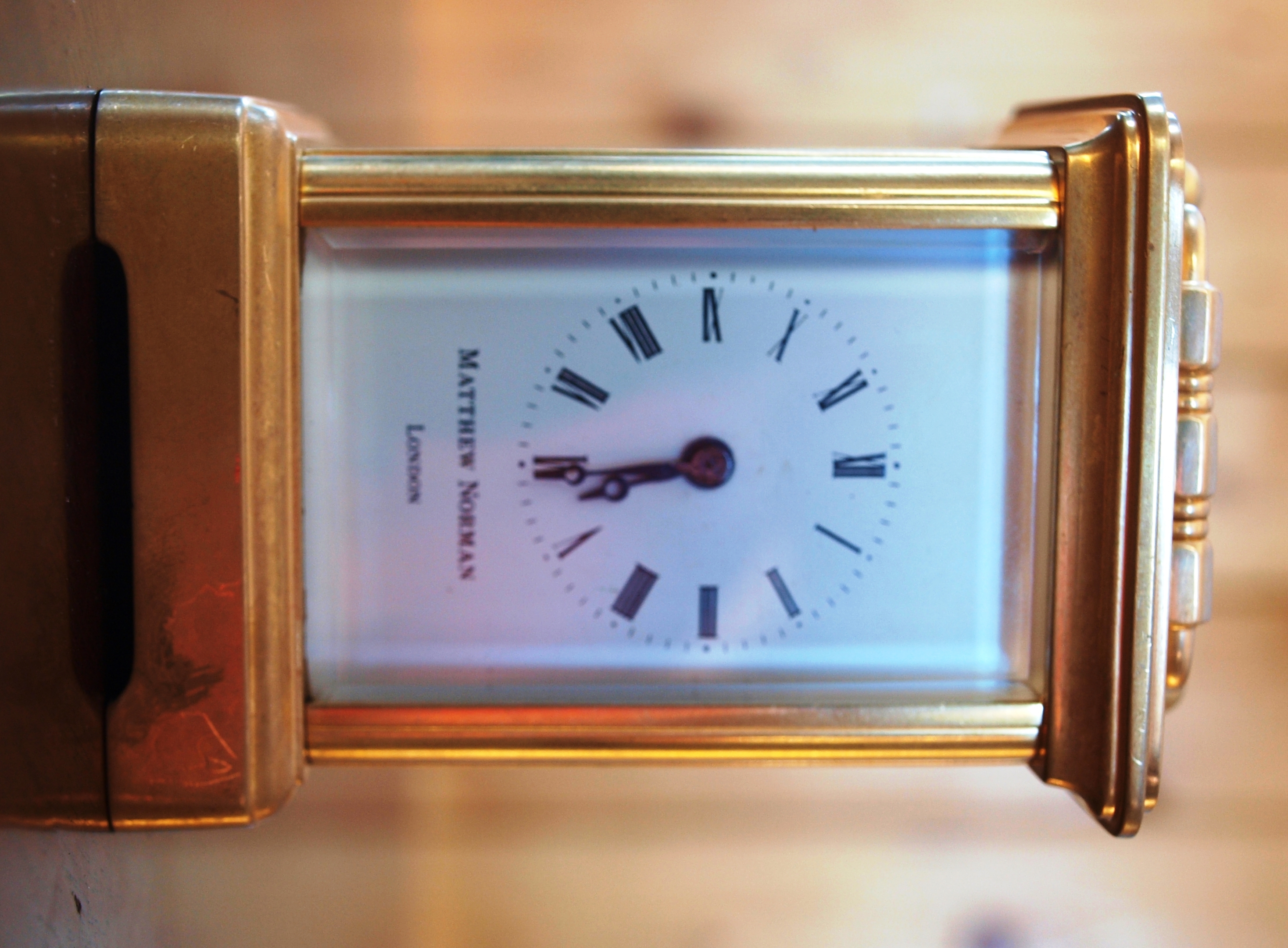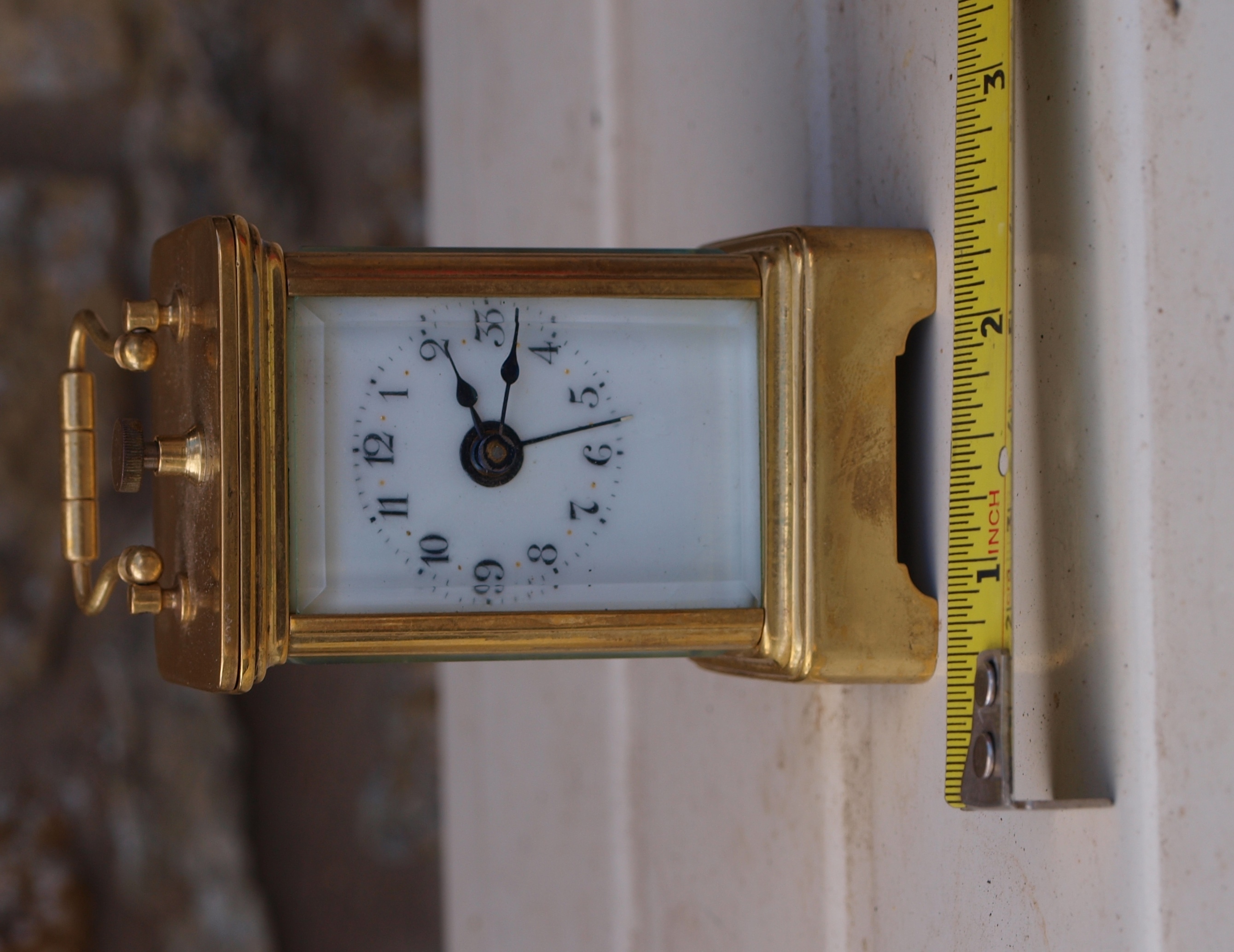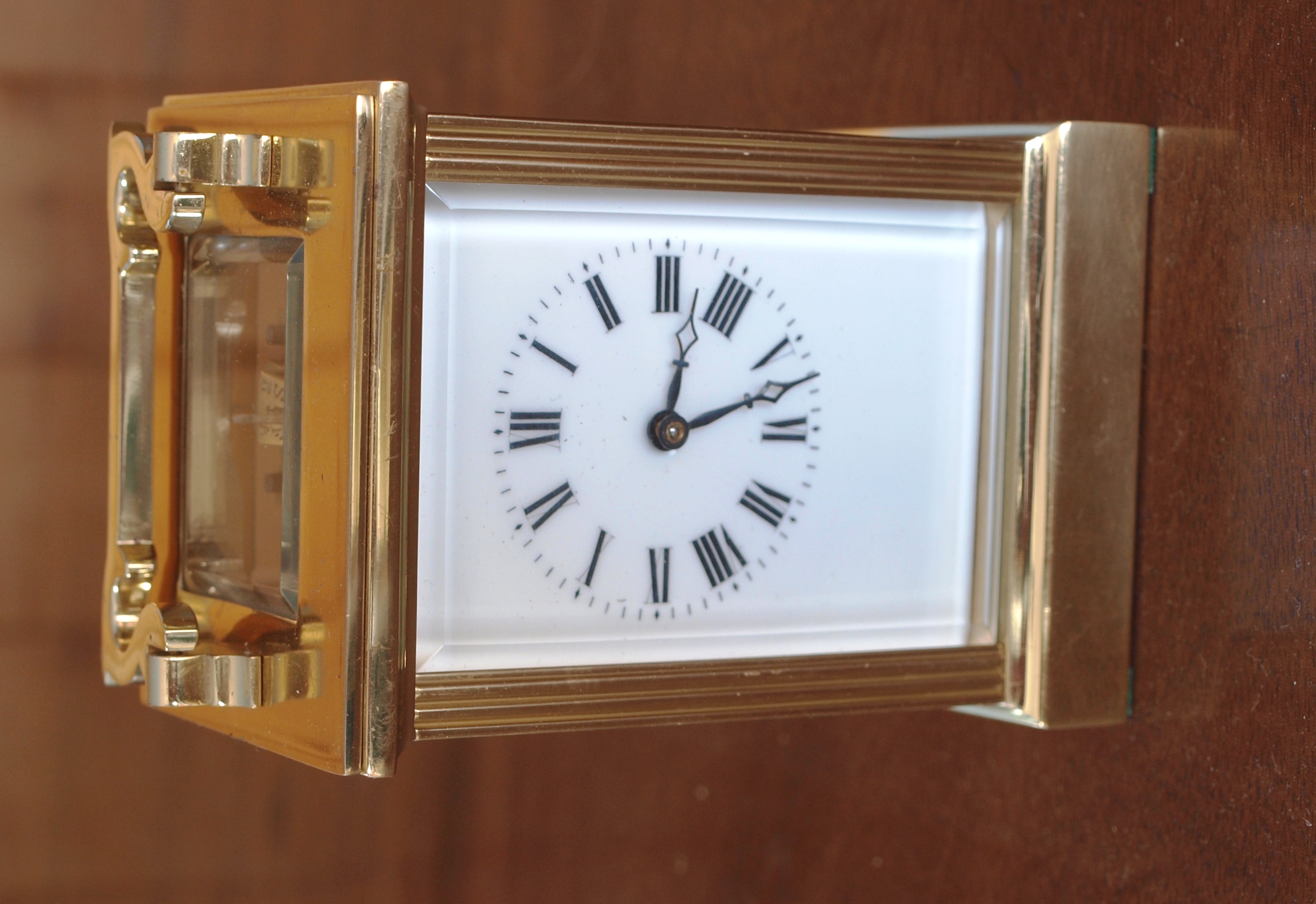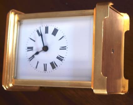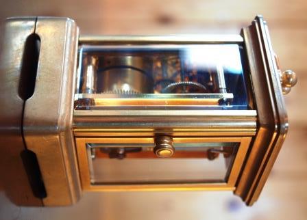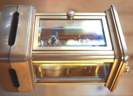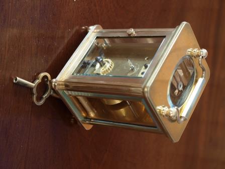 This is an Obis timepiece carriage clock with a cylinder platform.